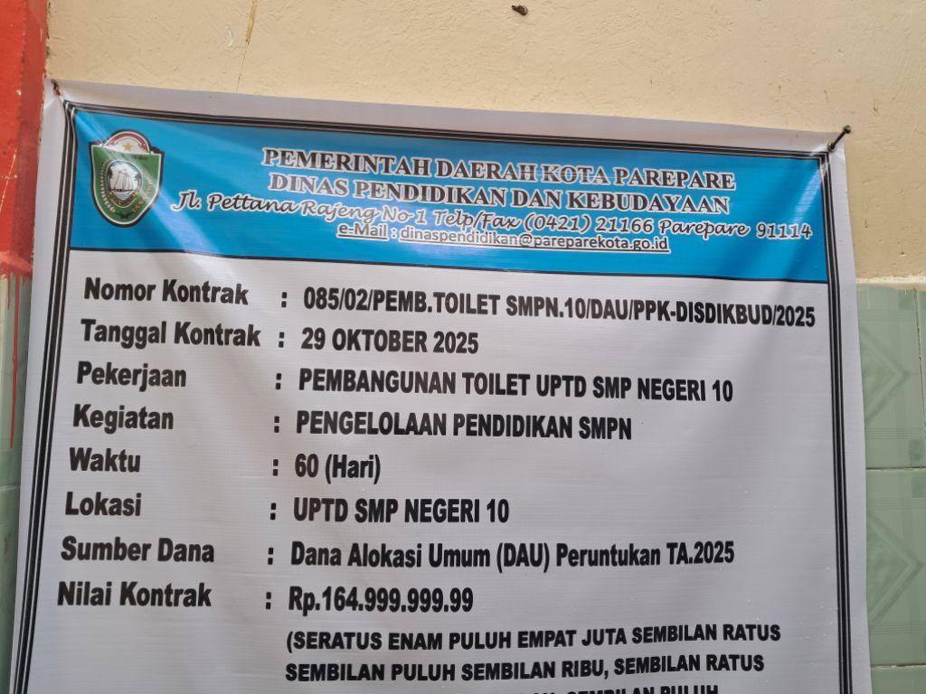 Pembangunan toilet SMPN 10 menelan anggaran Rp.164 juta lebih dengan pelaksana CV.Cahaya Maryam dari Dana Alokasi Umum (DAU) Pemkot Parepare 2025. Pihak ke 3 yang sama juga sebagai pelaksana di pembangunan Toilet di SDN 09 Parepare, namun anggarannya berbeda.