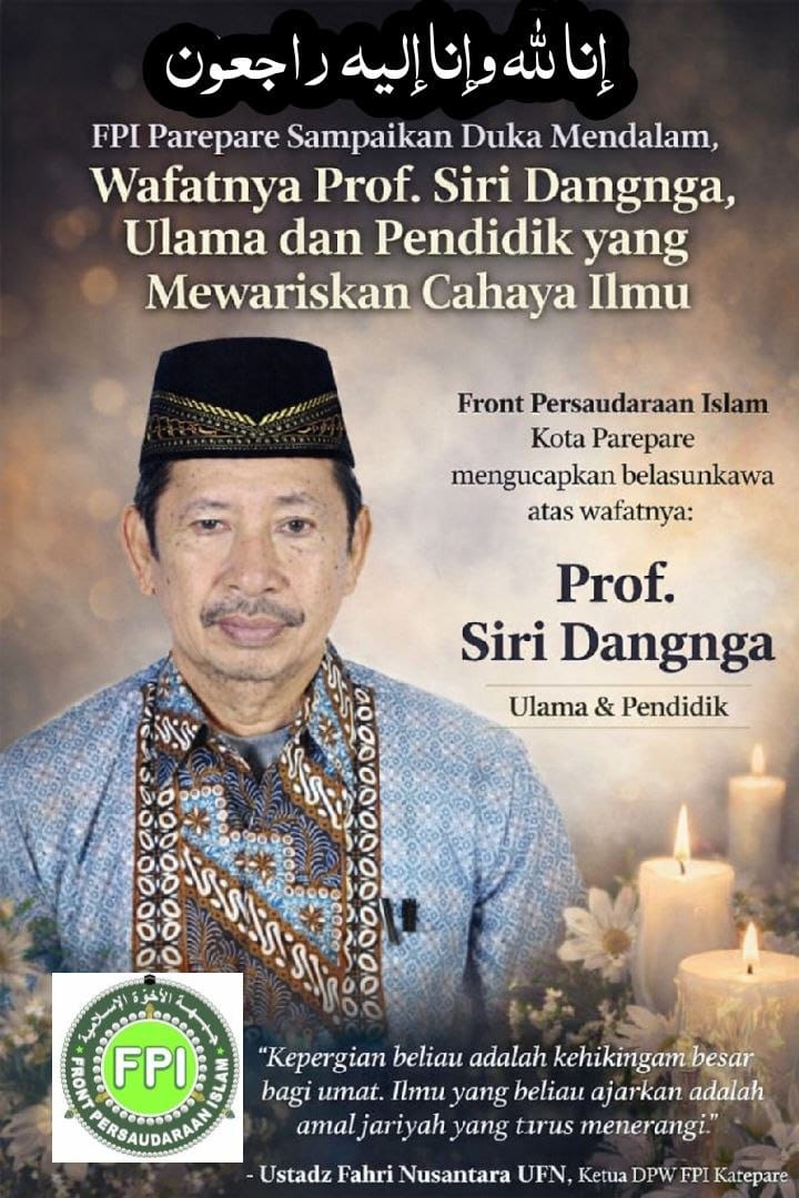 PADDENNUANG.COM. Parepare — Front Persaudaraan Islam (FPI) Kota Parepare berduka dan berbelasungkawa yang dalam wafatnya Prof. Siri Dangnga. Ulama Visioner yang dinilai sebagai pewaris